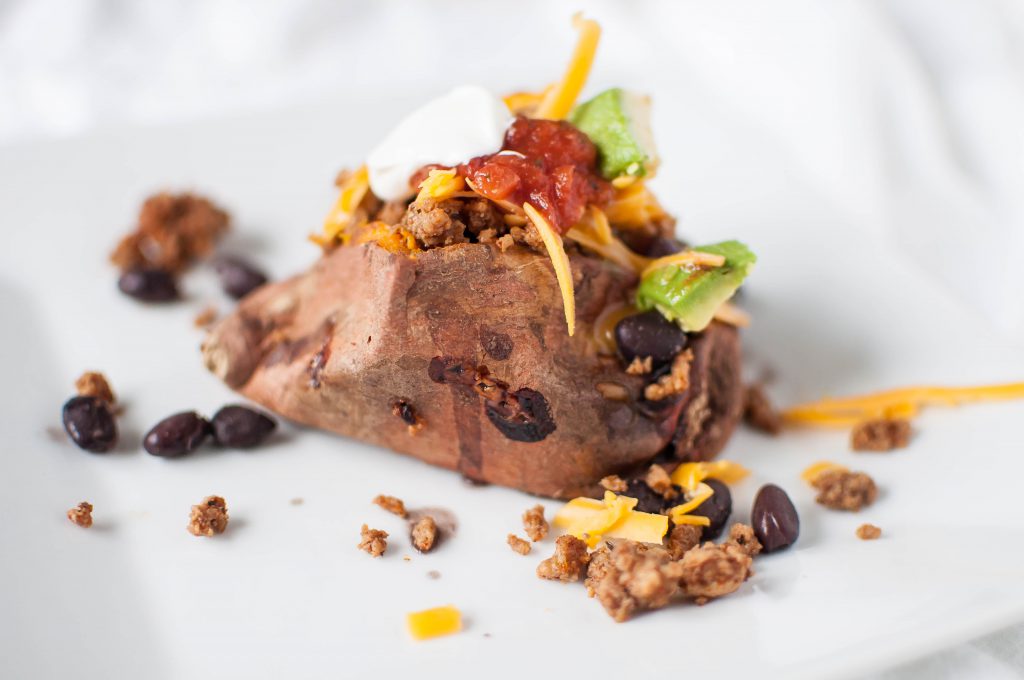 First, I opted for a sweet potato over a traditional russet to up the nutrition factor. Then I filled them with lean ground turkey spiced with my favorite homemade taco seasoning and black beans for some protein that makes them super filling. Then you can get creative as you want, topping them with your favorite taco accompaniments.