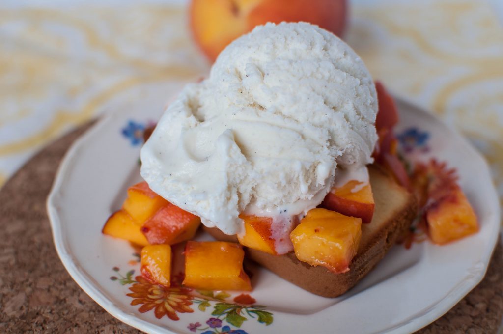 - To make each sundae, place a slice of toasted pound cake on a plate, then top with a 1/4 cup scoop of Breyers® Natural Vanilla Ice Cream and cover generously with macerated peaches.