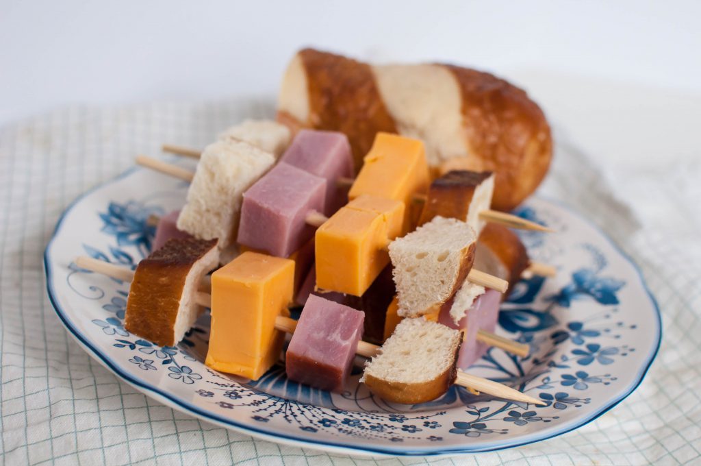 Pretzel bread is a favorite of ours and Noah is definitely a ham kind of guy so I combined those along with some sharp cheddar to create a delicious little kabob. Serve with some mustard on the side for dipping.