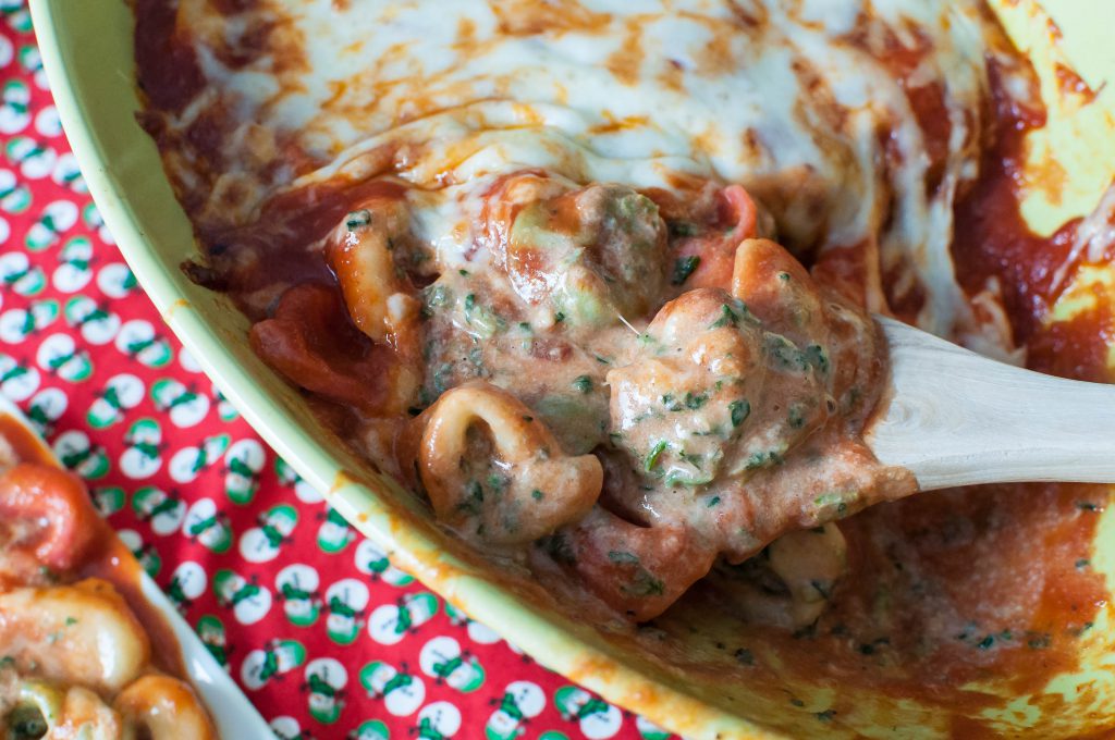 We’ve deemed this dish Christmas Tortellini because it’s filled with festive greens and red. Tri-color tortellini (red, green and white) is tossed with a simple, homemade spinach alfredo sauce then topped with jarred marinara, shredded mozzarella and baked to golden perfection.
