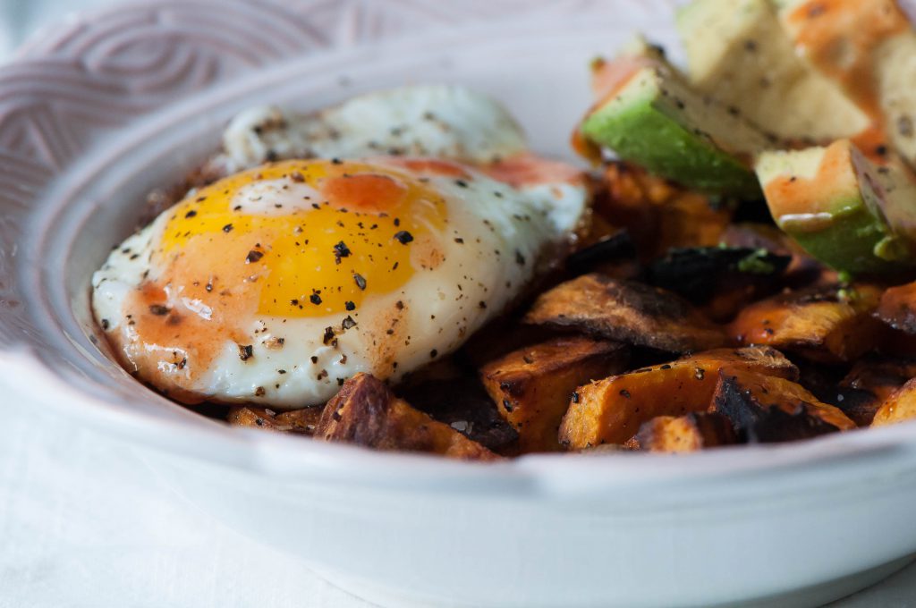 - Place cooked sweet potatoes in the bottom of a bowl. Top with fried egg and avocado. Add a few shakes of hot sauce.