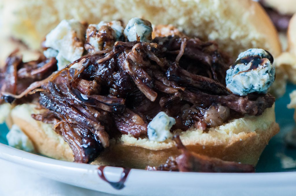 5. Once beef is done, remove from the slow cooker and shred with two forks. Place desired amount of beef on a slider bun, top with bleu cheese and drizzle with balsamic reduction.