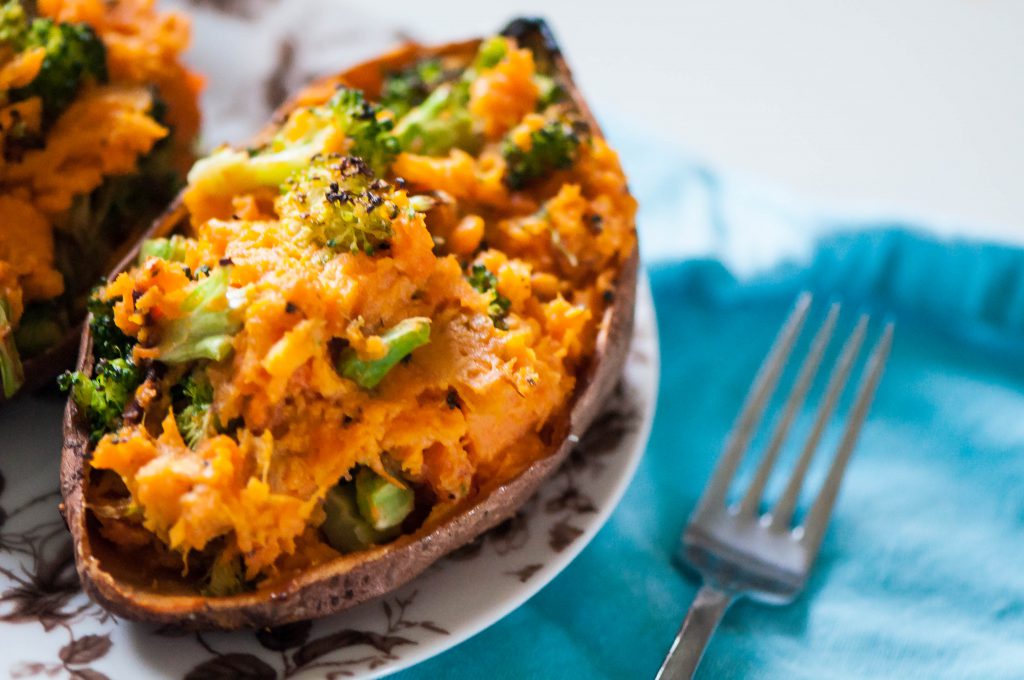 So what do you do when you want a comforting, creamy potato but not all the calories? Switch it out for a sweet potato which is naturally creamy on its own without having to add all that butter and sour cream. Then add some roasted broccoli and a smaller amount of cheese to still get that fix. The results are healthy AND delicious cheesy broccoli twice baked potatoes.