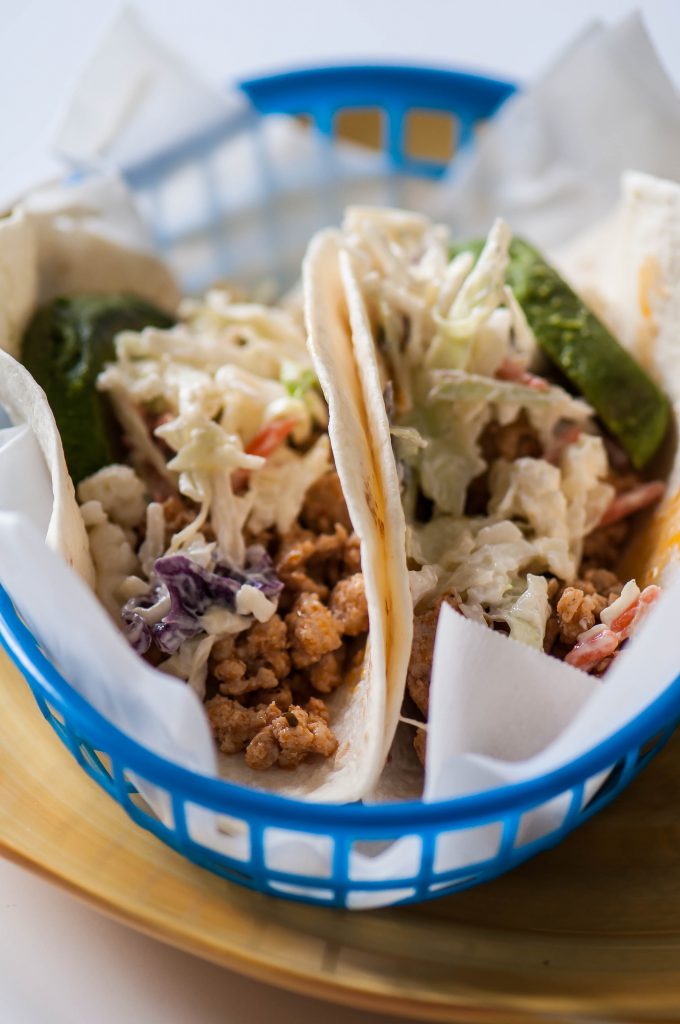 3. Assemble the tacos: lay out a flour tortilla and add buffalo chicken, bleu cheese slaw and avocado. Eat!