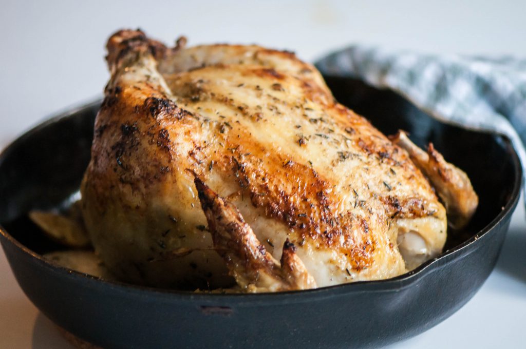 There aren’t many things better than a roasted chicken on a Sunday night. Am I right? Especially one that is slathered in a lemon thyme compound butter then roasted in a cast iron skillet until golden brown and juicy. This chicken is especially flavorful due to a layering of flavors and double duty use of ingredients.