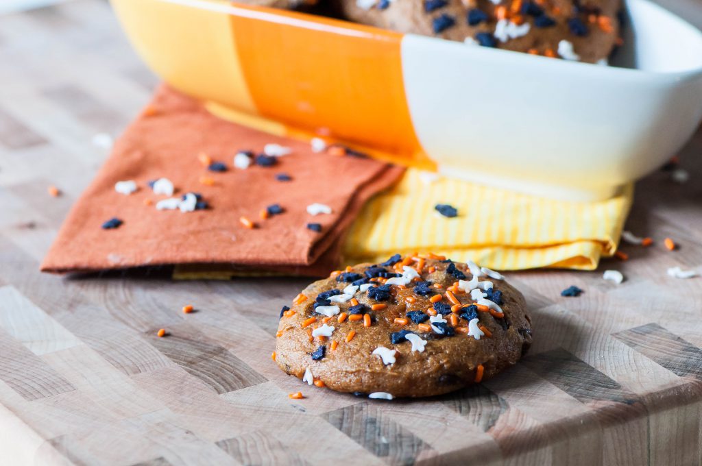 Pumpkin Chocolate Chip Muffies are the best part of the muffin, the tops. Muffin batter is baked like cookies to create moist, dense muffin tops bursting with pumpkin, fall spices and dark chocolate chips. Topped with Halloween sprinkles to give them a spooky, festive vibe these are perfect for your Halloween breakfast or after school snacks.