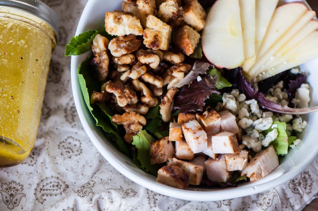 The maple syrup in the dressing and the apples bring a yummy sweetness to the salad as well as those coveted fall flavors. The mustard and bleu cheese add a strong, sharpness to the salad to balance the sweet ingredients.