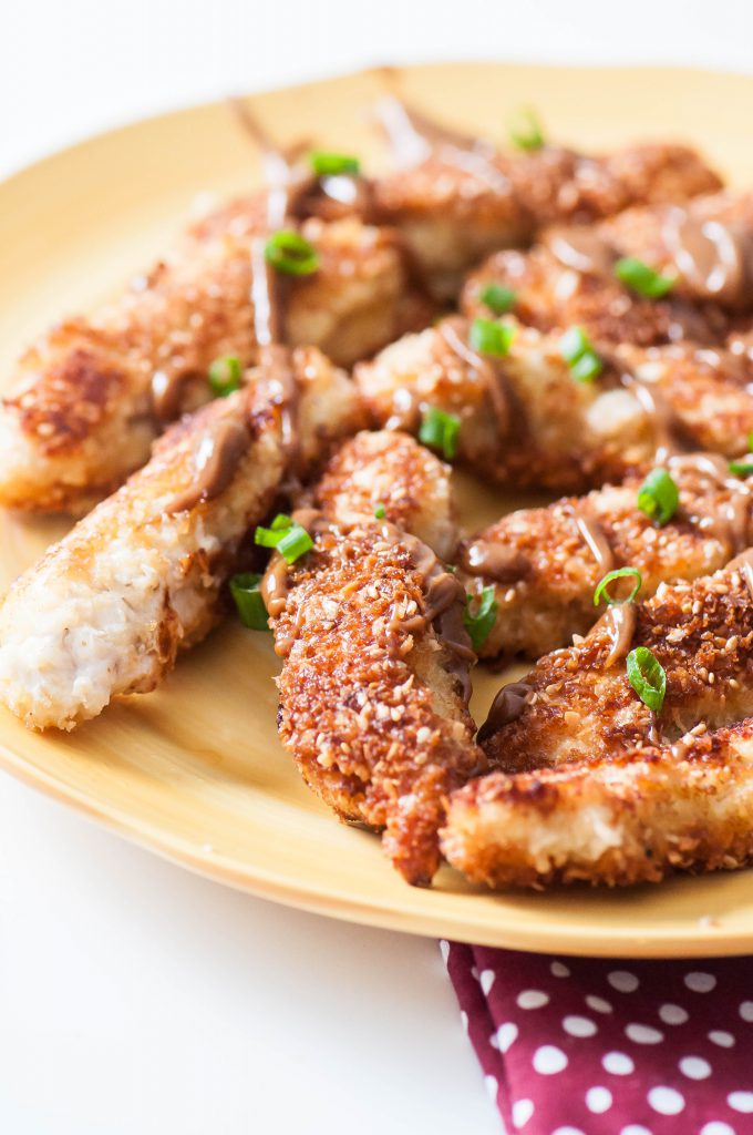 I coated these tenders in panko breadcrumbs for an extra crunch factor, unsweetened coconut and sesame seeds. The coconut adds sweetness to the tenders and extra texture and crunch along with the sesame seeds.