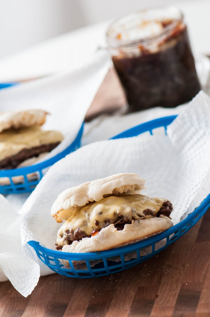 Today’s burgers may just blow your mind. Homemade burger patties, smoky gouda cheese and that amazing bacon onion jam from last week all combine on a toasted English muffin to create a unique and incredibly delicious burger.