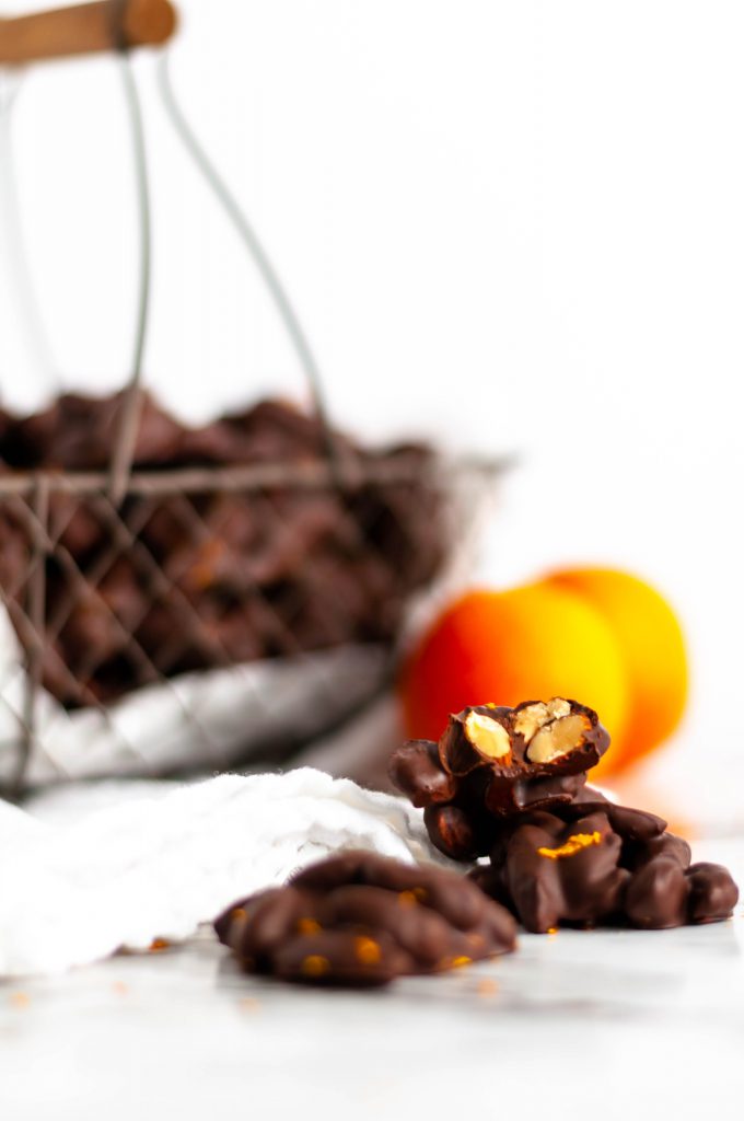 Because the almonds are roasted, they are super crunchy which pairs nicely with the creamy chocolate. For me, dark chocolate is the only way to go here with the sweet blood orange zest.